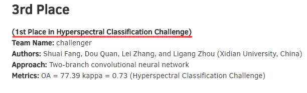 2018年IEEE GRSS Data Fusion Contest结果揭晓,西电威廉williamhill体育焦李成教授团队分别在三个赛道取得了丰硕成绩,其中高光谱分类赛道,王爽教授指导的队伍challenger(方帅,权豆等)获得第一名;多光谱LiDAR数据分类赛道,焦李成教授指导的队伍IPIU(程林,李阁等)获得第三名。